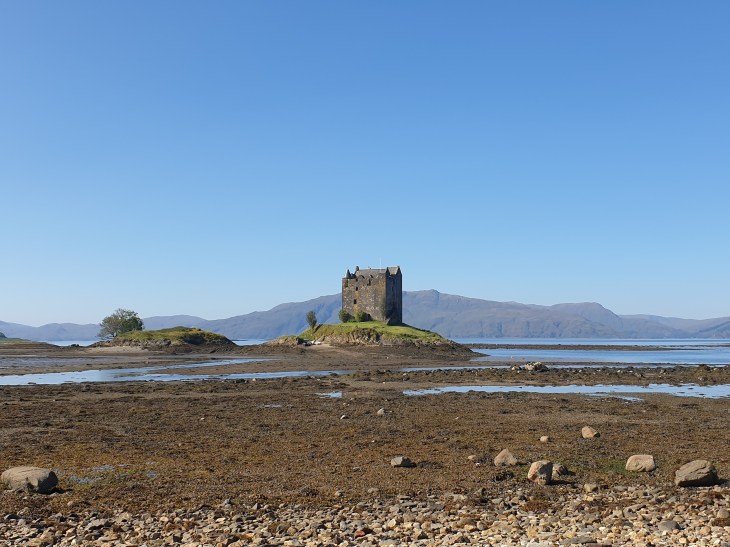 We had decided on a walk to Castle Stalker in Appin, which is just north of Oban, so we took the route up along the west side of Loch Lomond, then through Glencoe. To be fair, I’d probably have suggested this route anyway as it is awesome. I’m sure I’ve written about driving through Glencoe before, but this time was a bit special: blazing sunshine, blue skies.